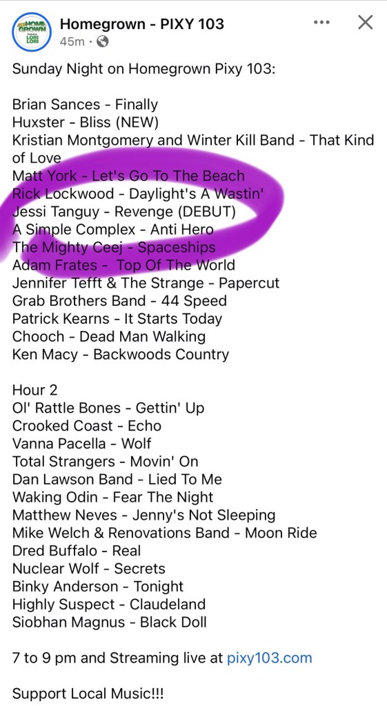 Sunday 3/8 between 7-8pm my song Revenge will be on PIXY 103’s Homegrown Showcase!!