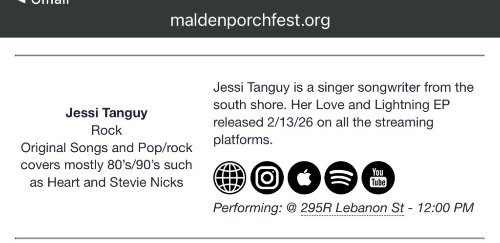 I’m playing at the Pillory Pub Songwriter Round Wednesday 3-25-26Saturday May 30th at noon I will play at Malden Porchfest! Stay tuned for more info!